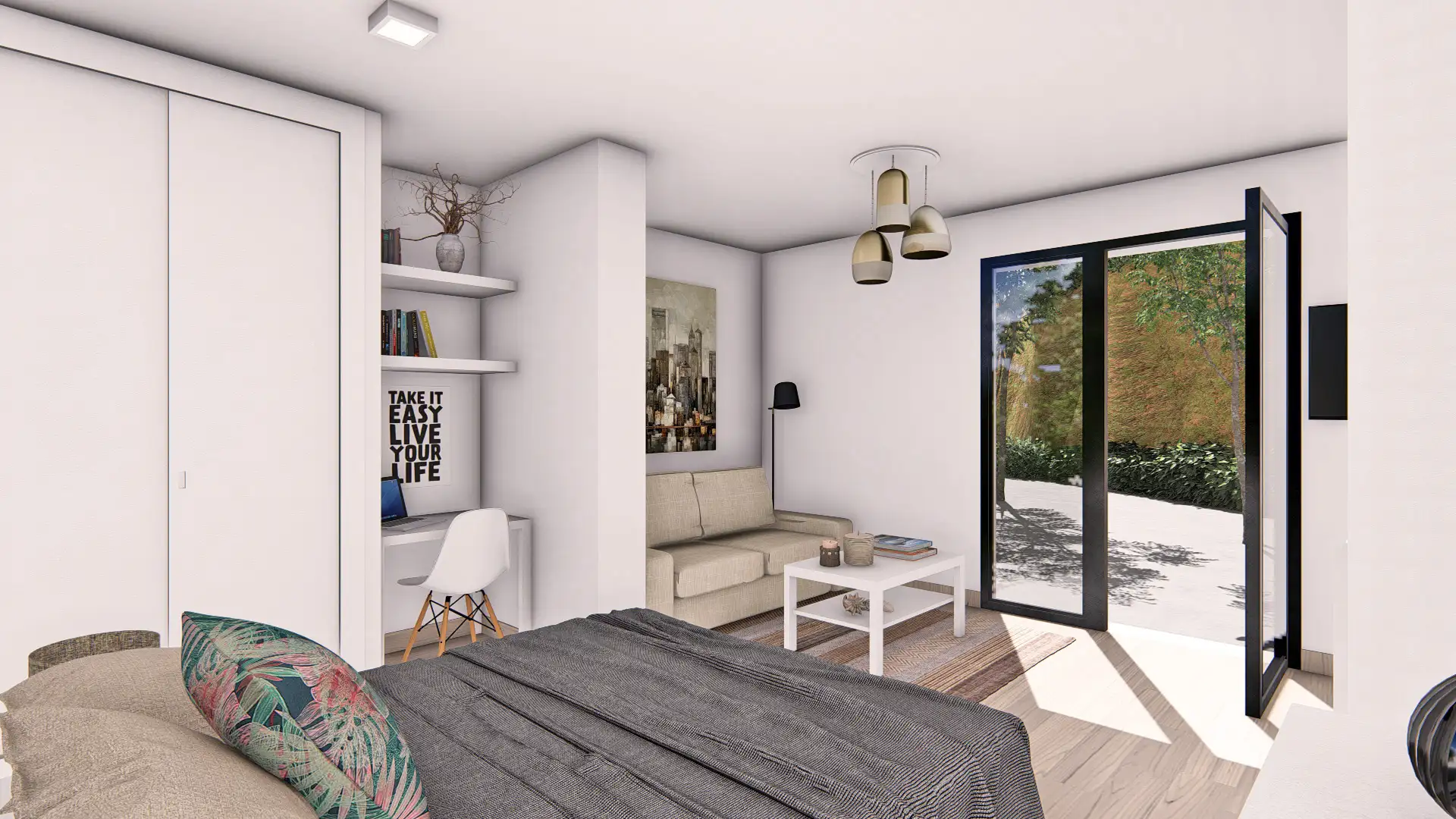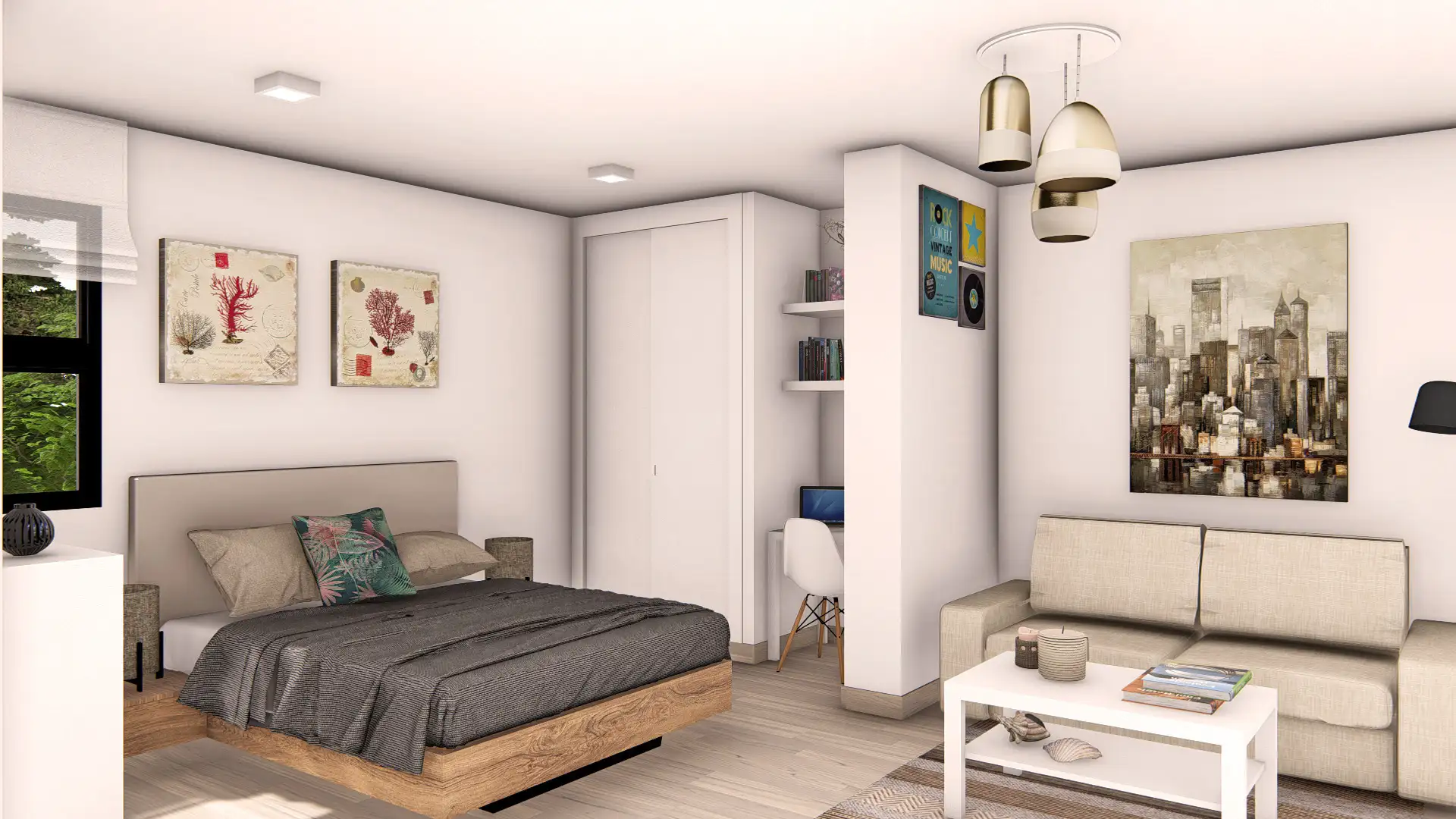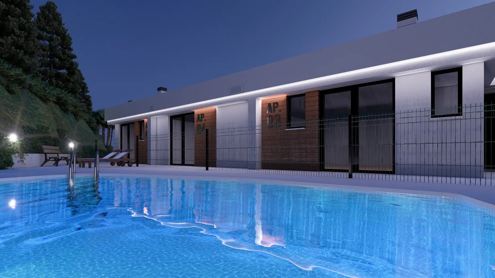 El revestimiento exterior mediante sistema SATE y paneles de PVC con acabado efecto madera oculta el carácter industrial del contenedor, mejora su comportamiento termoacústico y lo transforma en una arquitectura contemporánea, cálida y plenamente integrada en el entorno semirrural en el que se ubica. Asimismo, como solución técnica y estética, el conjunto se remata con un vuelo perimetral que aloja las instalaciones, evitando perforaciones en la parte superior de los contenedores. En la cubierta se instalarán paneles solares térmicos y fotovoltaicos para reducir aún más el consumo energético.