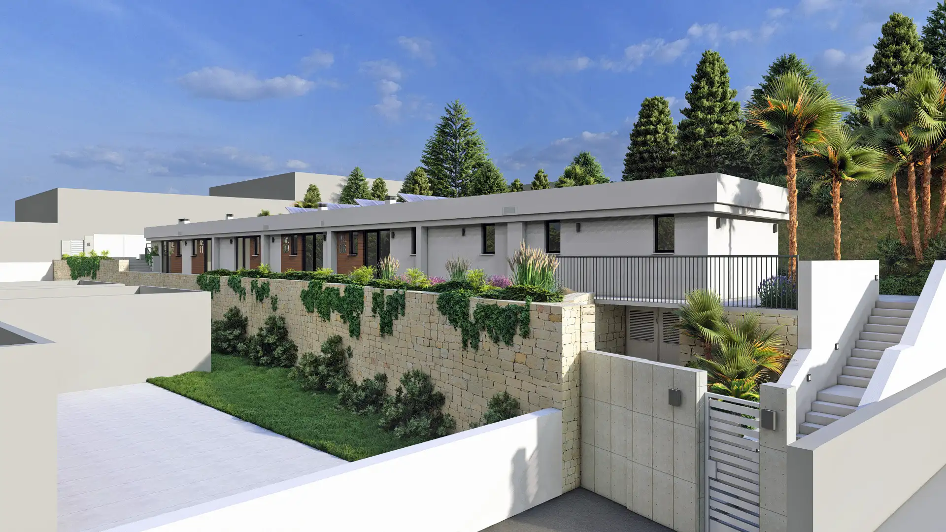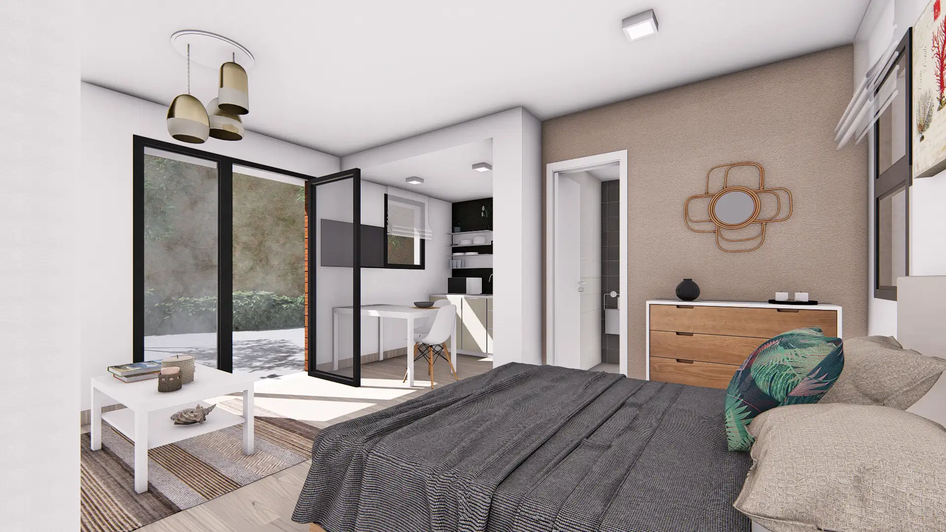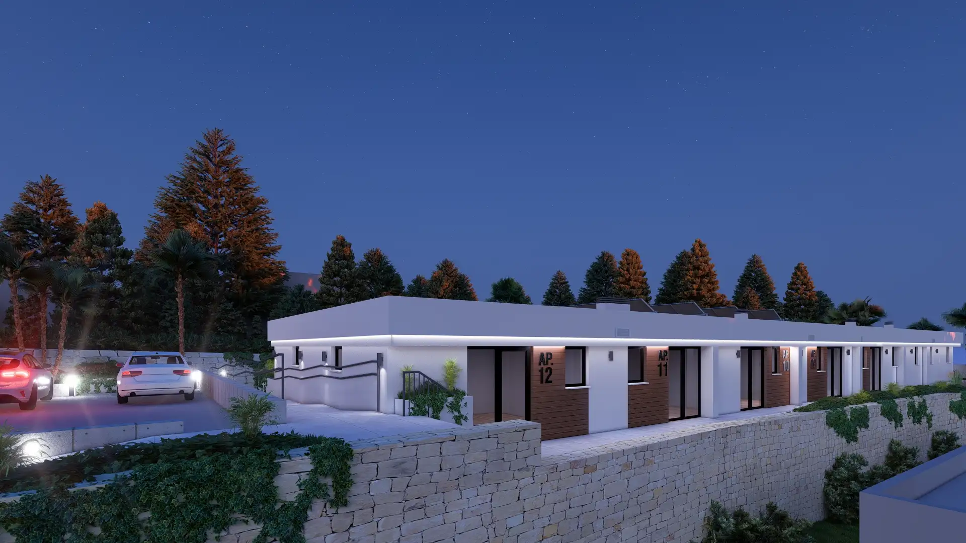 El revestimiento exterior mediante sistema SATE y paneles de PVC con acabado efecto madera oculta el carácter industrial del contenedor, mejora su comportamiento termoacústico y lo transforma en una arquitectura contemporánea, cálida y plenamente integrada en el entorno semirrural en el que se ubica. Asimismo, como solución técnica y estética, el conjunto se remata con un vuelo perimetral que aloja las instalaciones, evitando perforaciones en la parte superior de los contenedores. En la cubierta se instalarán paneles solares térmicos y fotovoltaicos para reducir aún más el consumo energético.