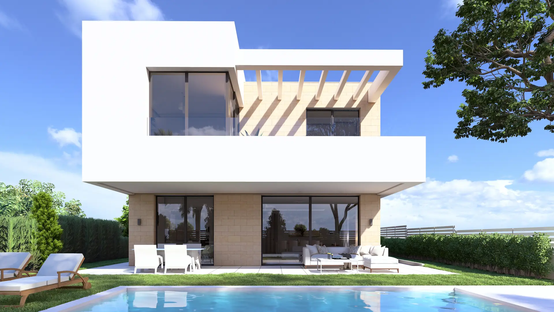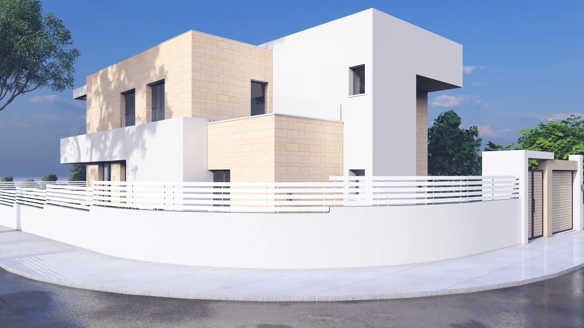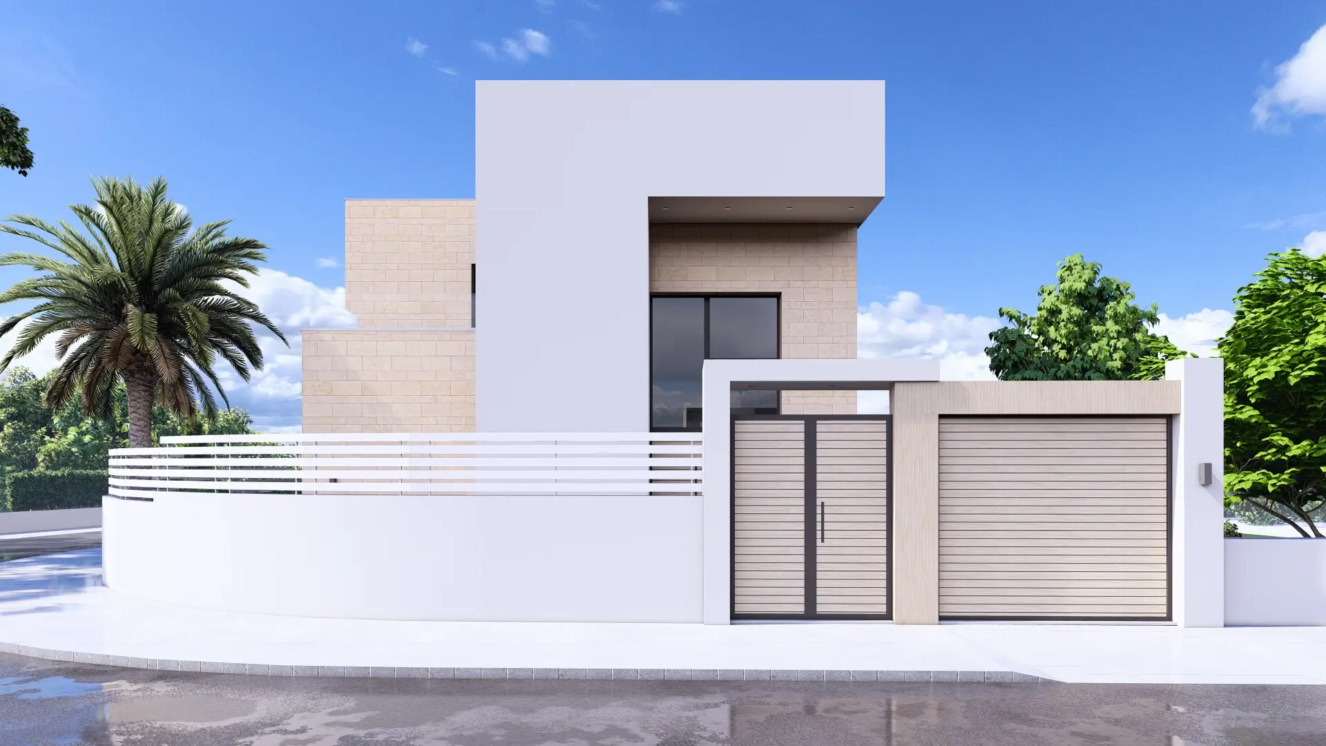 Vivienda de líneas limpias y volúmenes puros que se intersecan y sobresalen creando fachadas dinámicas. Predomina el blanco que se combina con la arenisca para darle estética mediterránea. Buscamos el equilibrio entre calidez y modernidad.