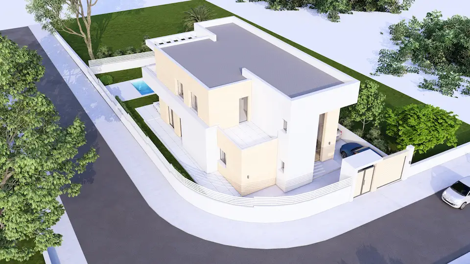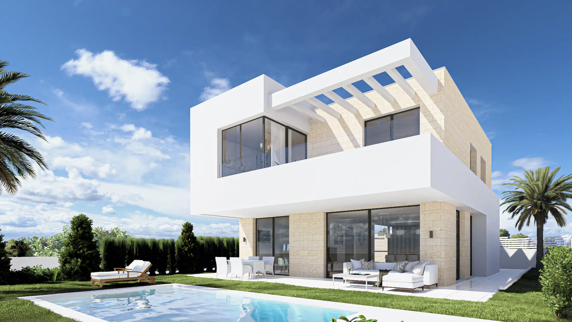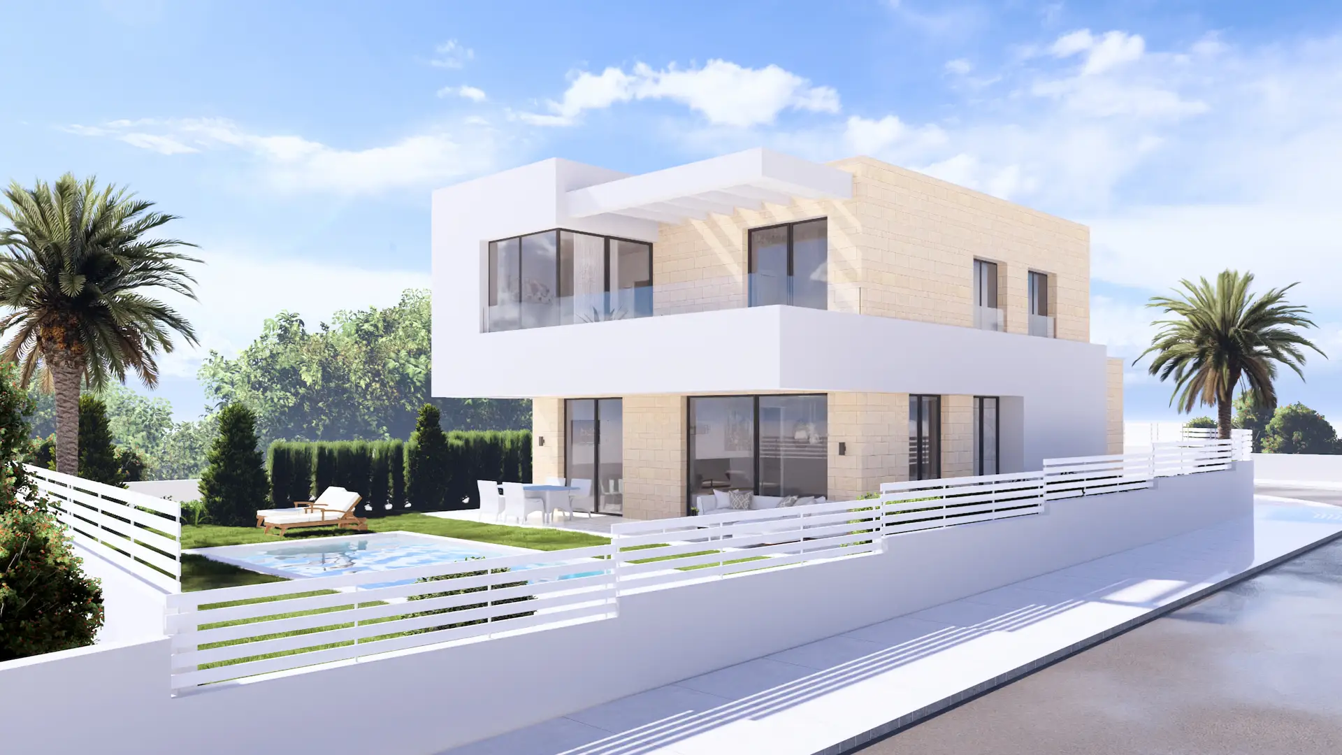 Vivienda de líneas limpias y volúmenes puros que se intersecan y sobresalen creando fachadas dinámicas. Predomina el blanco que se combina con la arenisca para darle estética mediterránea. Buscamos el equilibrio entre calidez y modernidad.