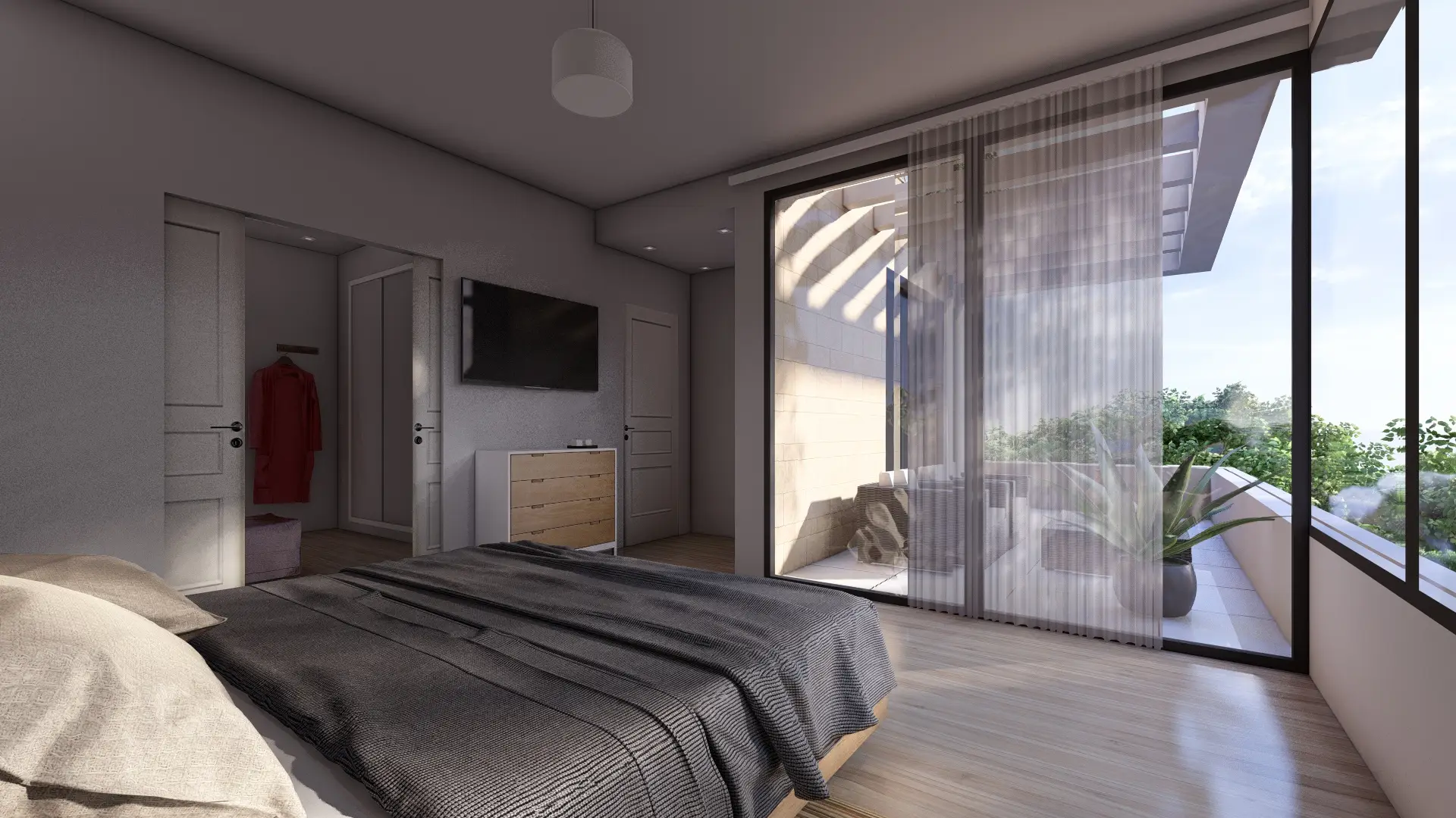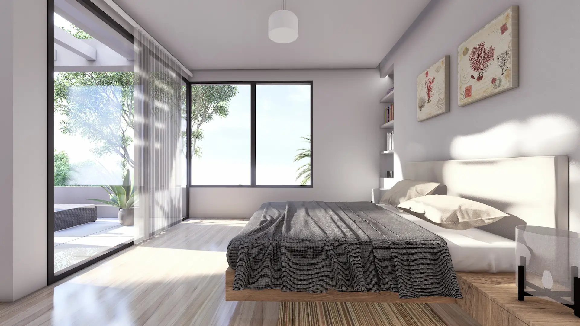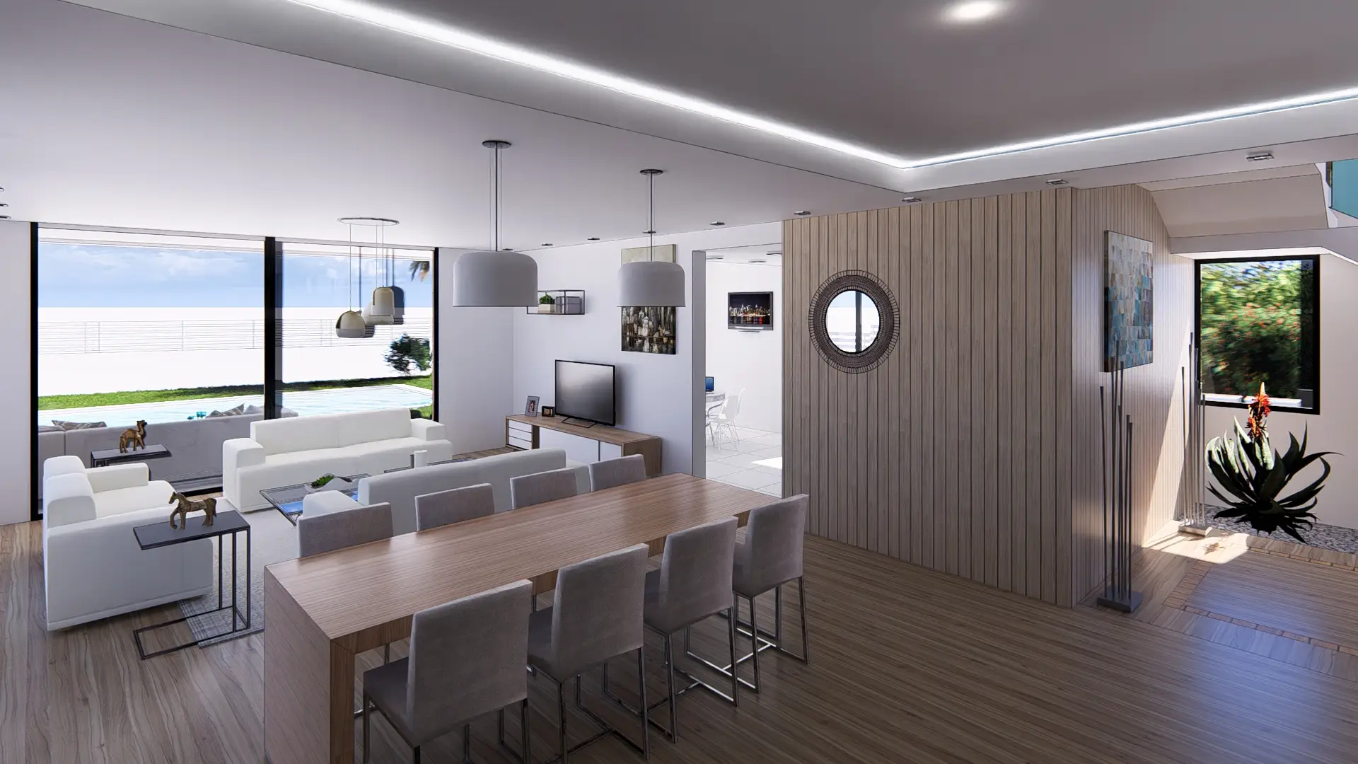 El volumen superior vuela ampliamente sobre la planta baja, prolongando la vivienda hacia la terraza, configurando un área social continua. Con las grandes aberturas facilitamos una fluida conexión entre espacios interiores y exteriores, potenciando la entrada de luz natural y la integración con el jardín donde se creará un microclima agradable dado que se carece de vistas.