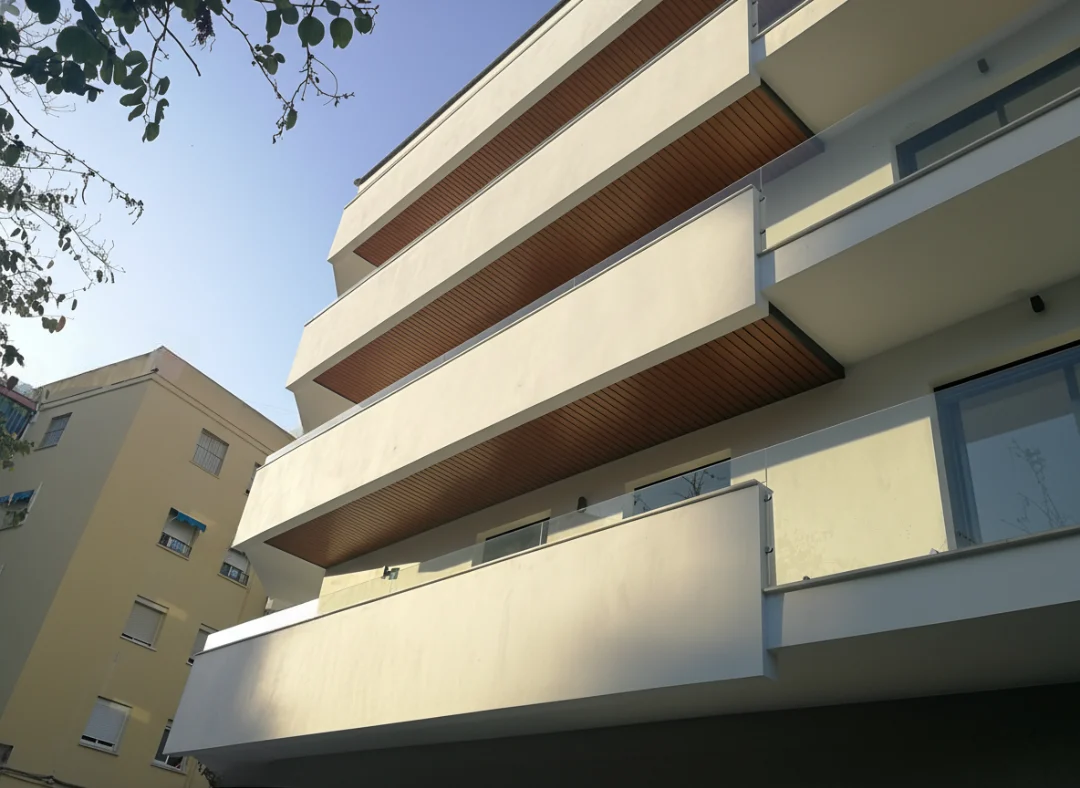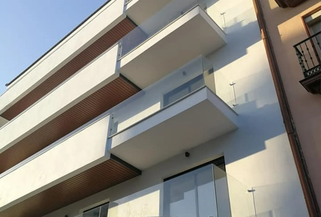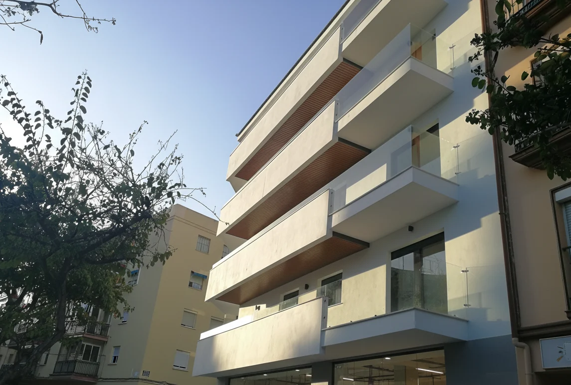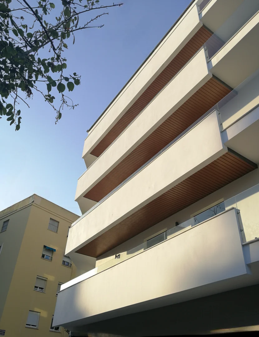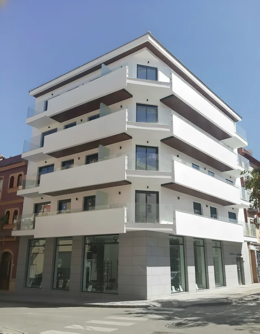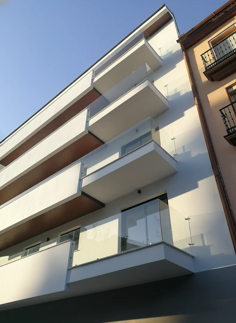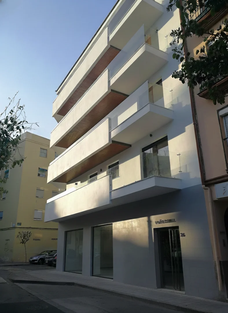 El edificio se articula mediante terrazas voladas continuas que generan una marcada horizontalidad en el conjunto. Las zonas totalmente acristaladas, libres de antepechos opacos y ubicadas de forma estratégica, permiten disfrutar las vistas desde el interior de las viviendas y, al mismo tiempo, inundan las estancias de luz natural. Las barandillas de vidrio refuerzan la sensación de transparencia, aportando ligereza y coherencia estética. En las terrazas se incorporan falsos techos con acabado en imitación madera, que introducen una nota cálida y amable en la composición.