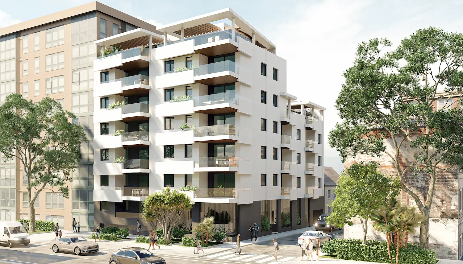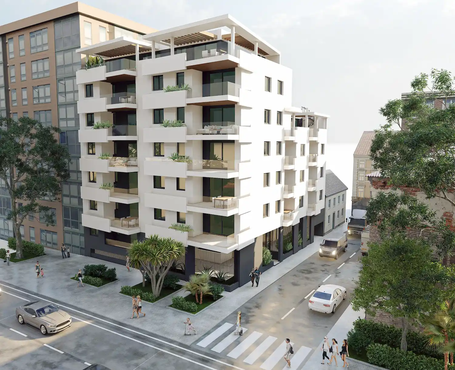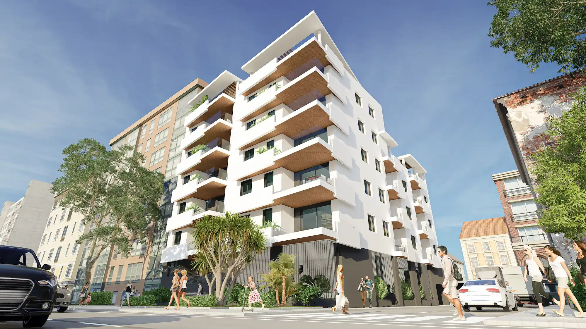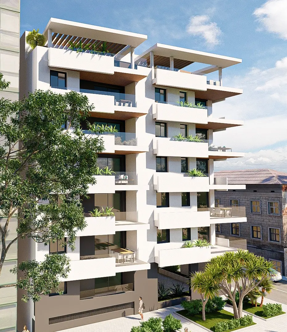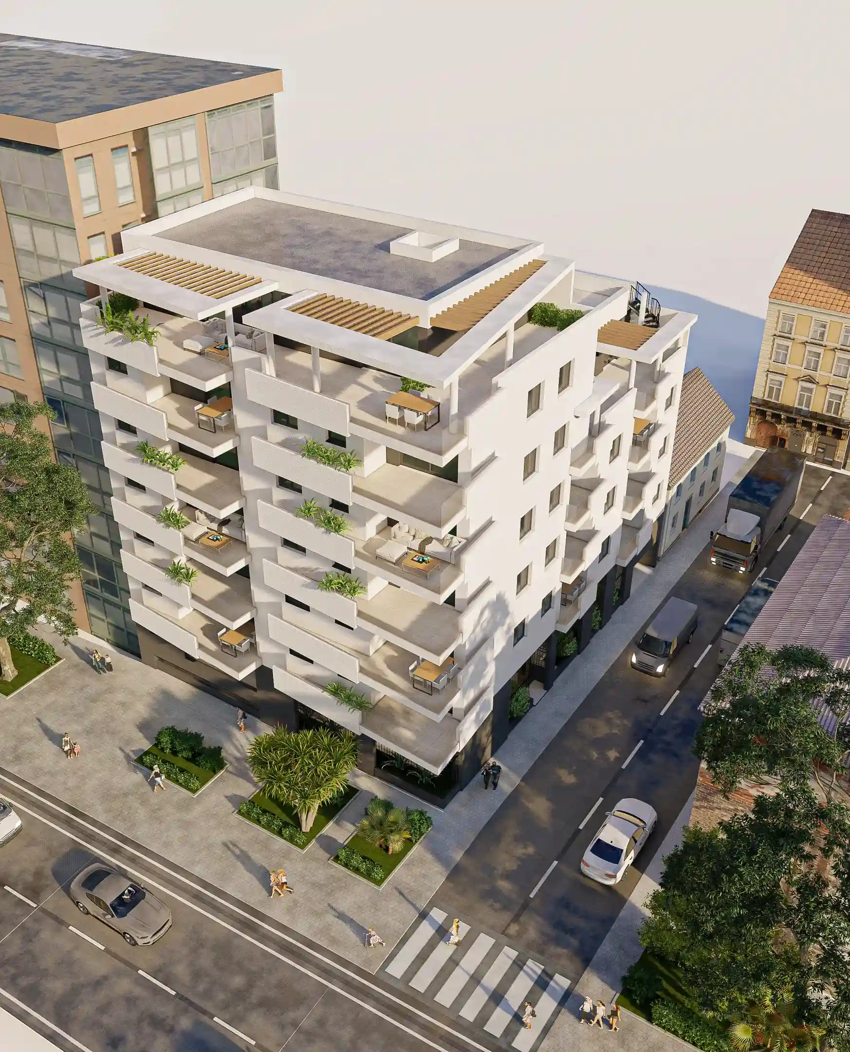 El edificio queda coronado mediante pérgolas blancas con viguetas de madera que completan el conjunto y unifican visualmente la pieza desde todos sus ángulos.