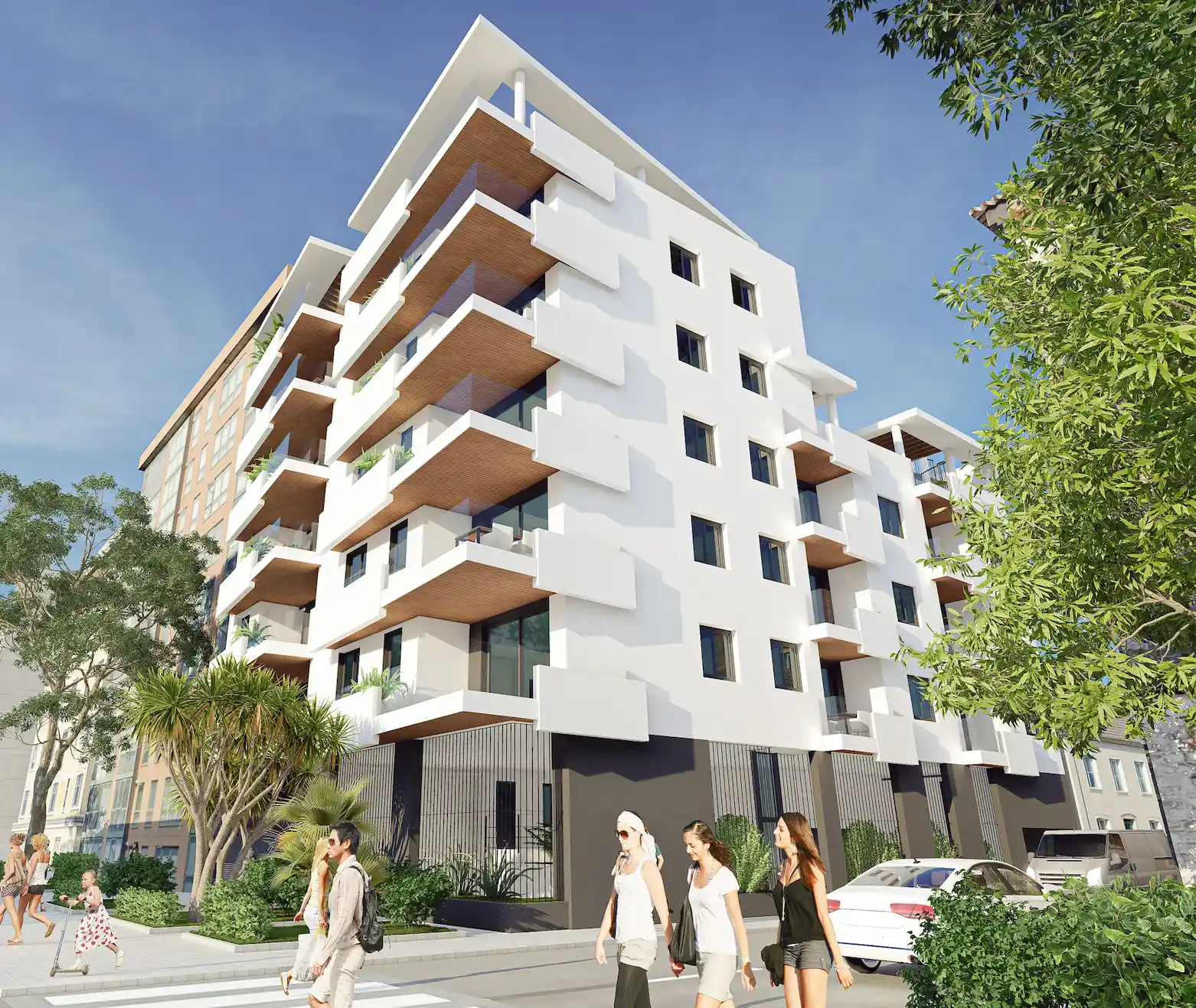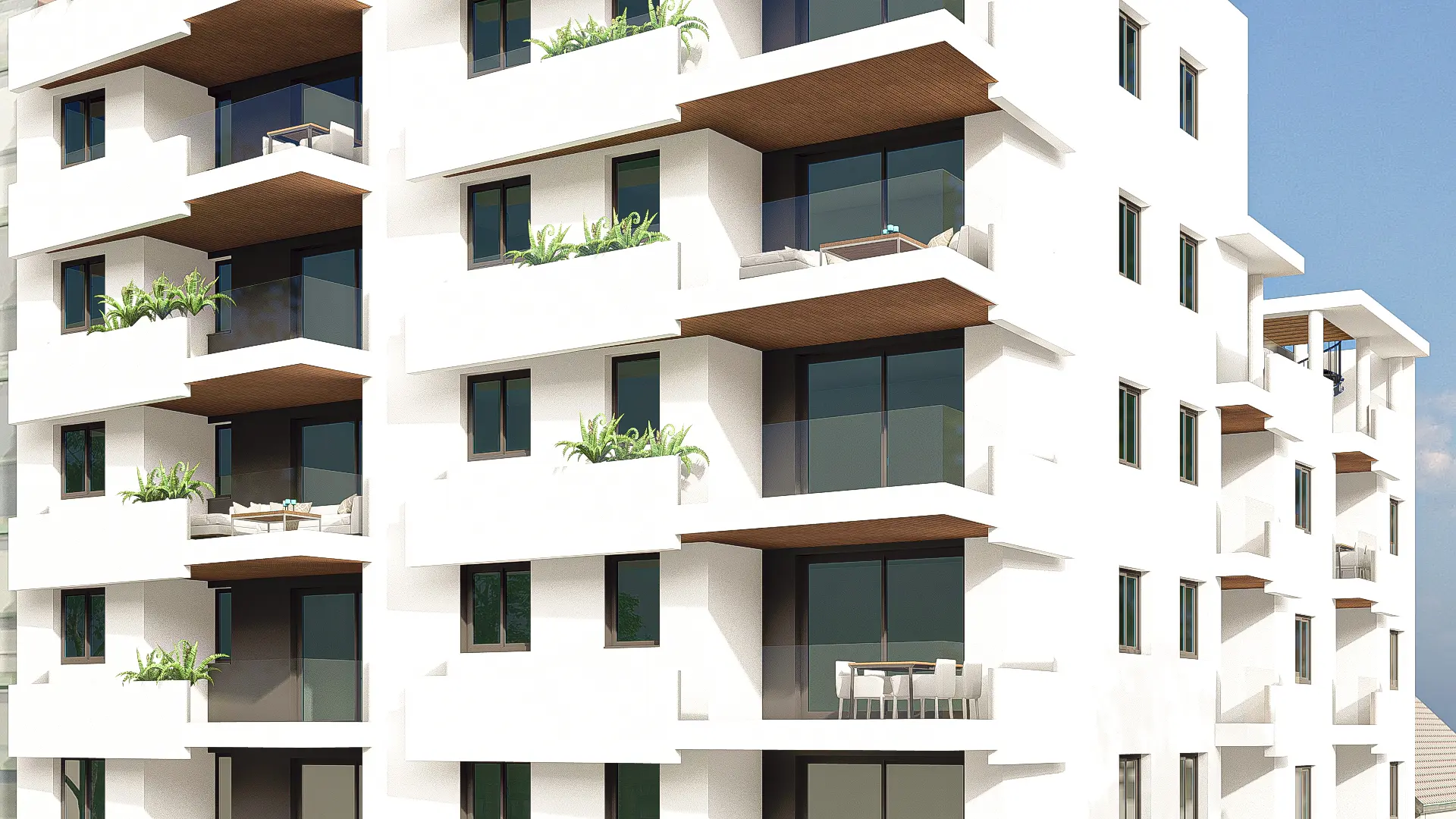 En las terrazas ubicamos de manera estratégica zonas con barandillas completamente acristaladas y libres de antepechos opacos para enmarcar las vistas desde el interior y permitir que la luz natural penetre profundamente en las viviendas. Se incorporan falsos techos con acabado en imitación madera como nota cálida en la composición.